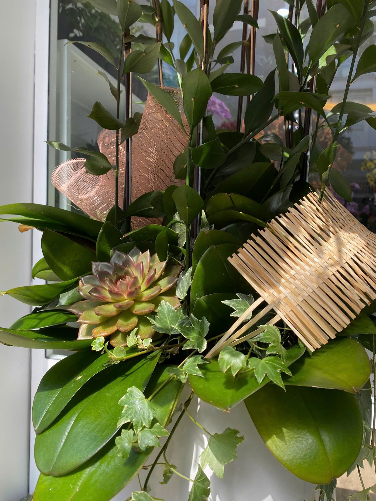 - Trang trí: cây sen đá, cây thường xuân, đan tre, vải lưới trang trí, chậu sứ màu trắng