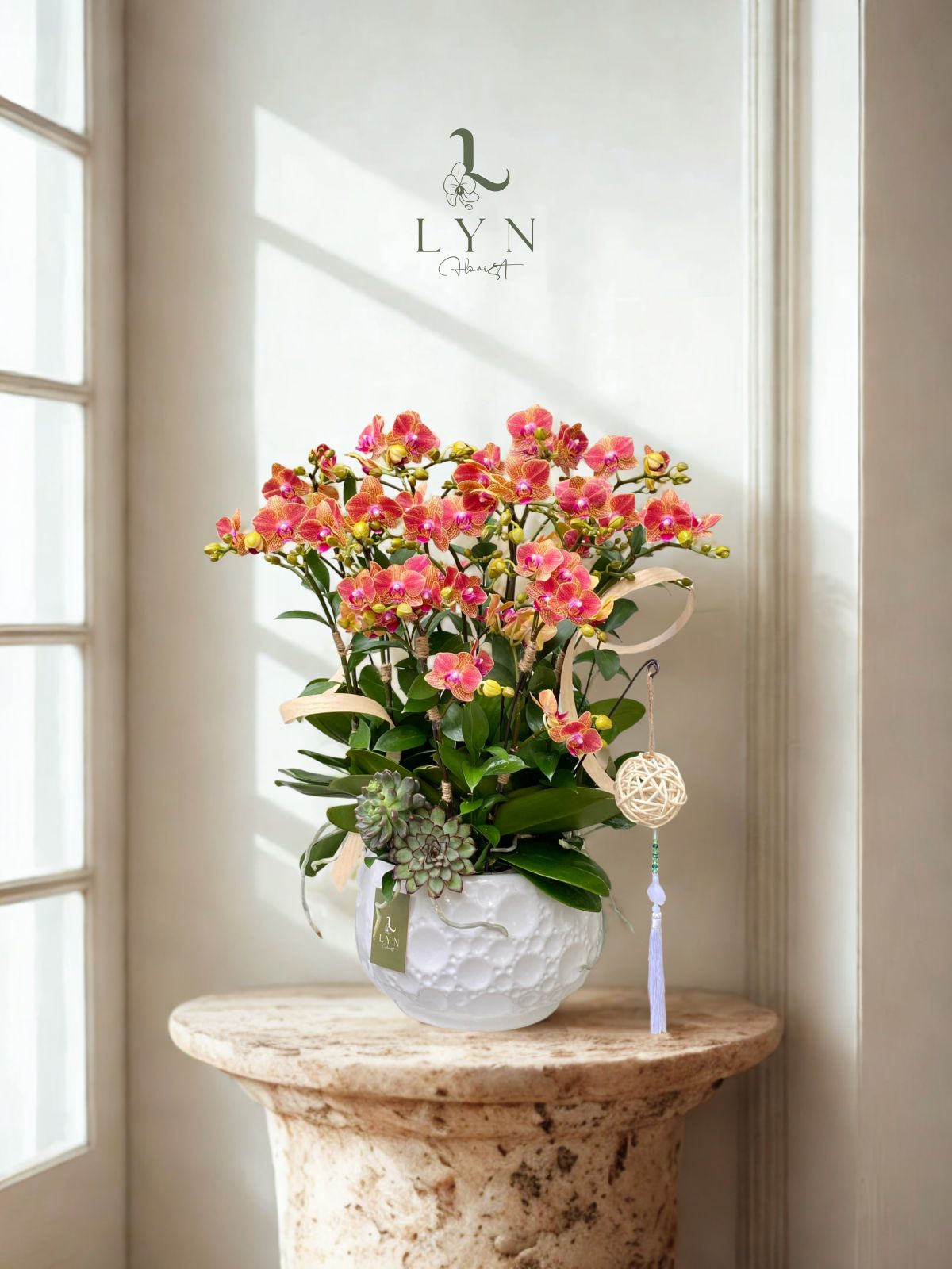 - Trang trí: lan chi, sen đá, lũa san hô, salix, lá chanh, dây tua rua, chậu sứ trắng vân sọc, (thiết kế nơ lụa và banner theo yêu cầu).