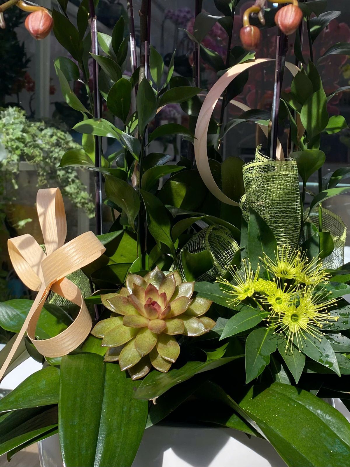 - Trang trí: sen đá, cây xanh, đan tre, vải lưới trang trí, chậu sứ trắng.